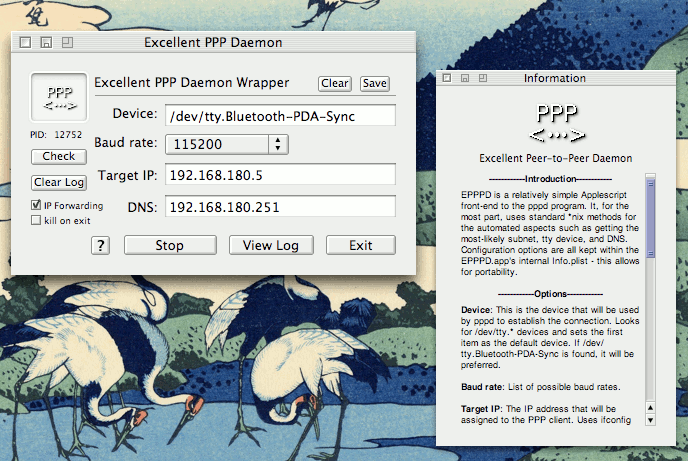 Save: Saves the settings for Device, Baud rate, Target IP, DNS, and kill on exit to EPPPD's internal Info.plist file.