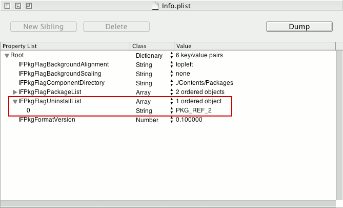 Now that you have the proper PKG_REF for your uninstall package, you can add it as a new String property to the IFPkgFlagUninstallList array - note that you can have more than one uninstall package by simply adding another String property to the array(just remember to specify the proper PKG_REF). Your metapackage's Info.plist should look similar to the following: