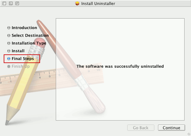 The first of these is to create a postflight script which closes down the Installation window and presents a simple dialog notifying the user that the application has uninstalled. However, even though this solution does have its merits, in that it is highly customizable through Applescript and otherwise, it is problematic in that it breaks the standard Installation GUI in creating an isolated dialog.